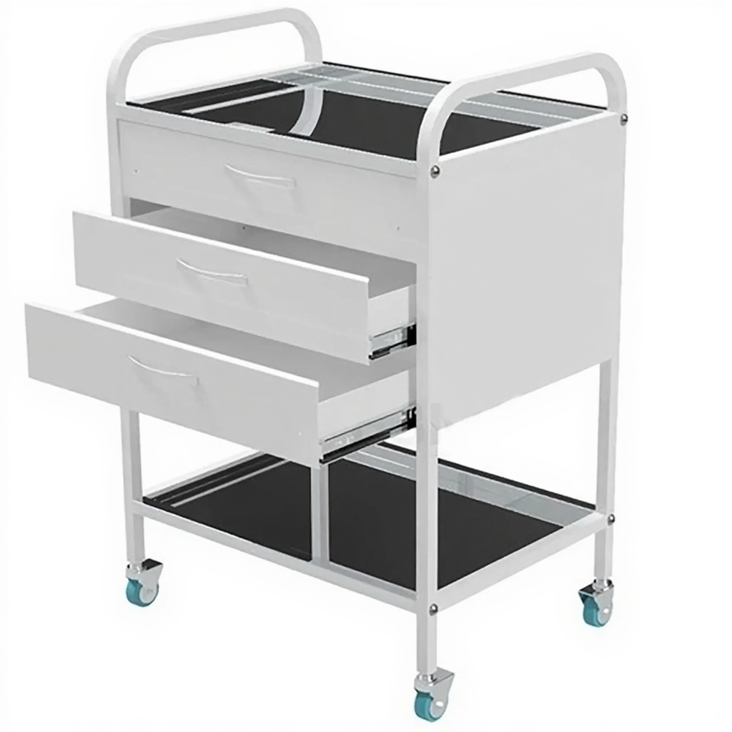 Стол медицинский инструментальный СМИ-02-03 (полки нерж., колёса серая резина) — это передвижная тумба, предназначенная для размещения инструмента, лекарственных препаратов и приборов в медицинских учреждениях и лабораториях. Модель имеет каркас из профильной стальной трубы, три выдвижных ящика и верхнюю полку из нержавеющей стали.