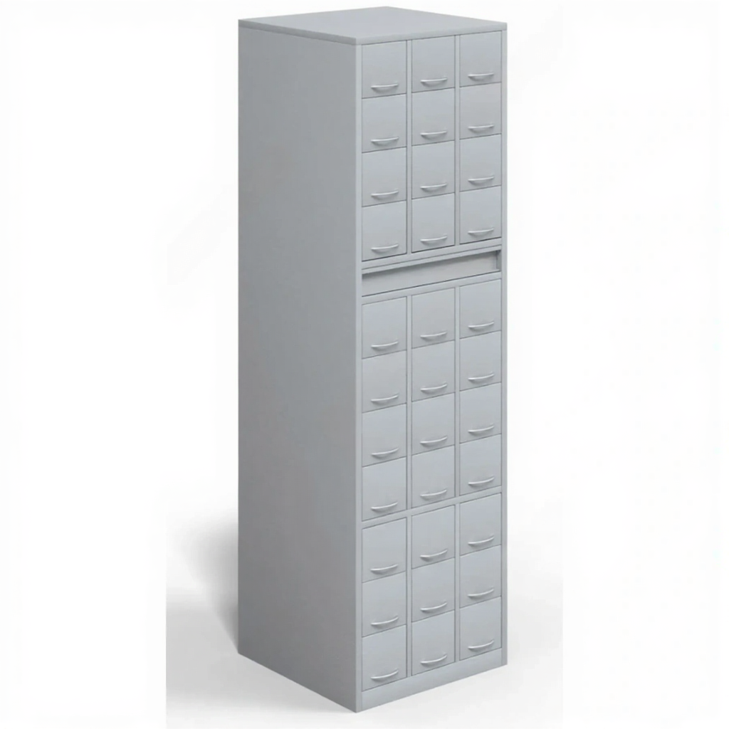 - 33 выдвижных ячейки — достаточная вместимость для хранения библиотечных карточек.