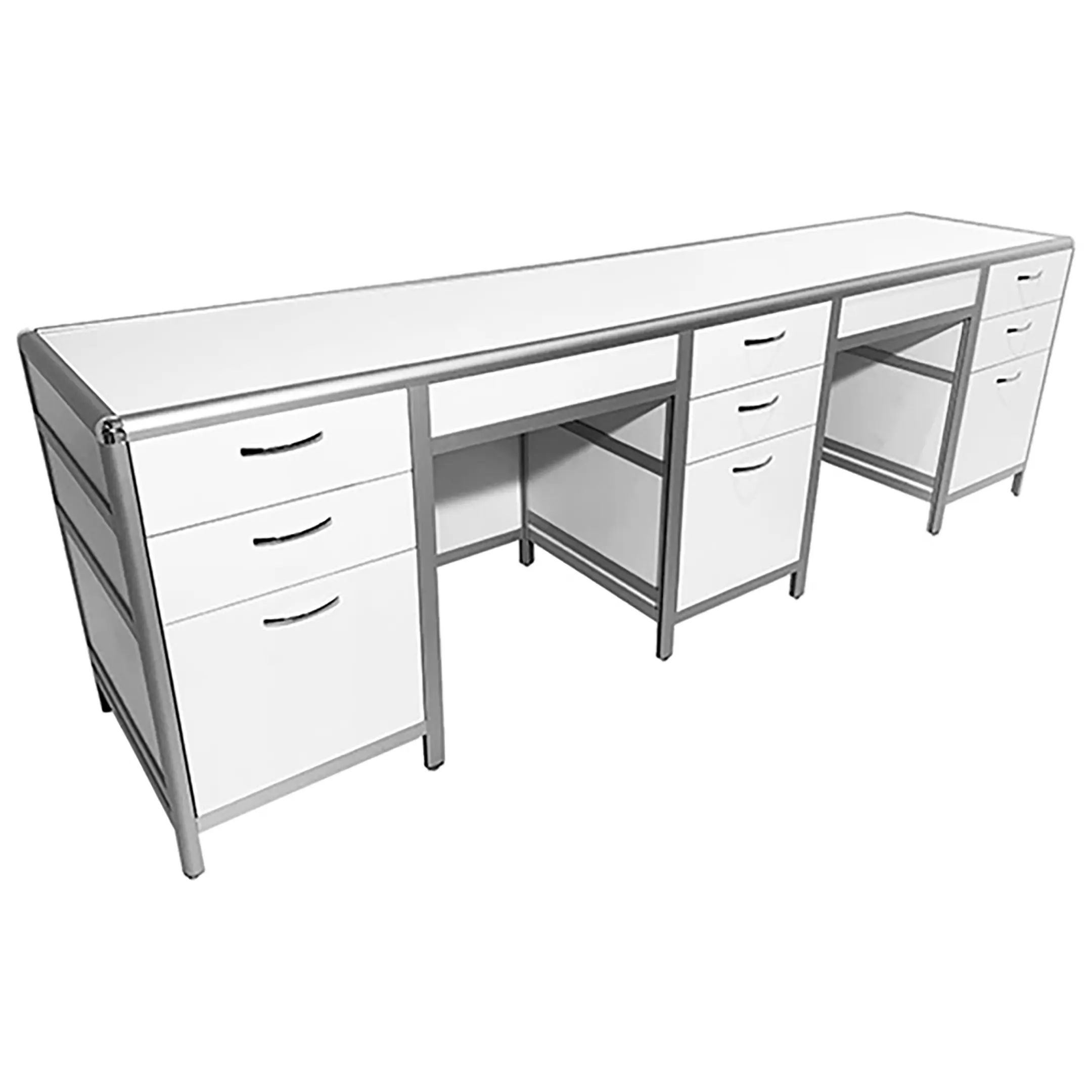 Стол лабораторный MED 10.013al (белый) — это идеальное решение для обустройства рабочего места сотрудников в лабораториях и медицинских учреждениях. Модель оснащена тремя тумбами, каждая с тремя выдвижными ящиками, обеспечивая обширное пространство для хранения. Каркас выполнен из алюминиевого профиля, столешница из ЛДСП толщиной 22 мм.