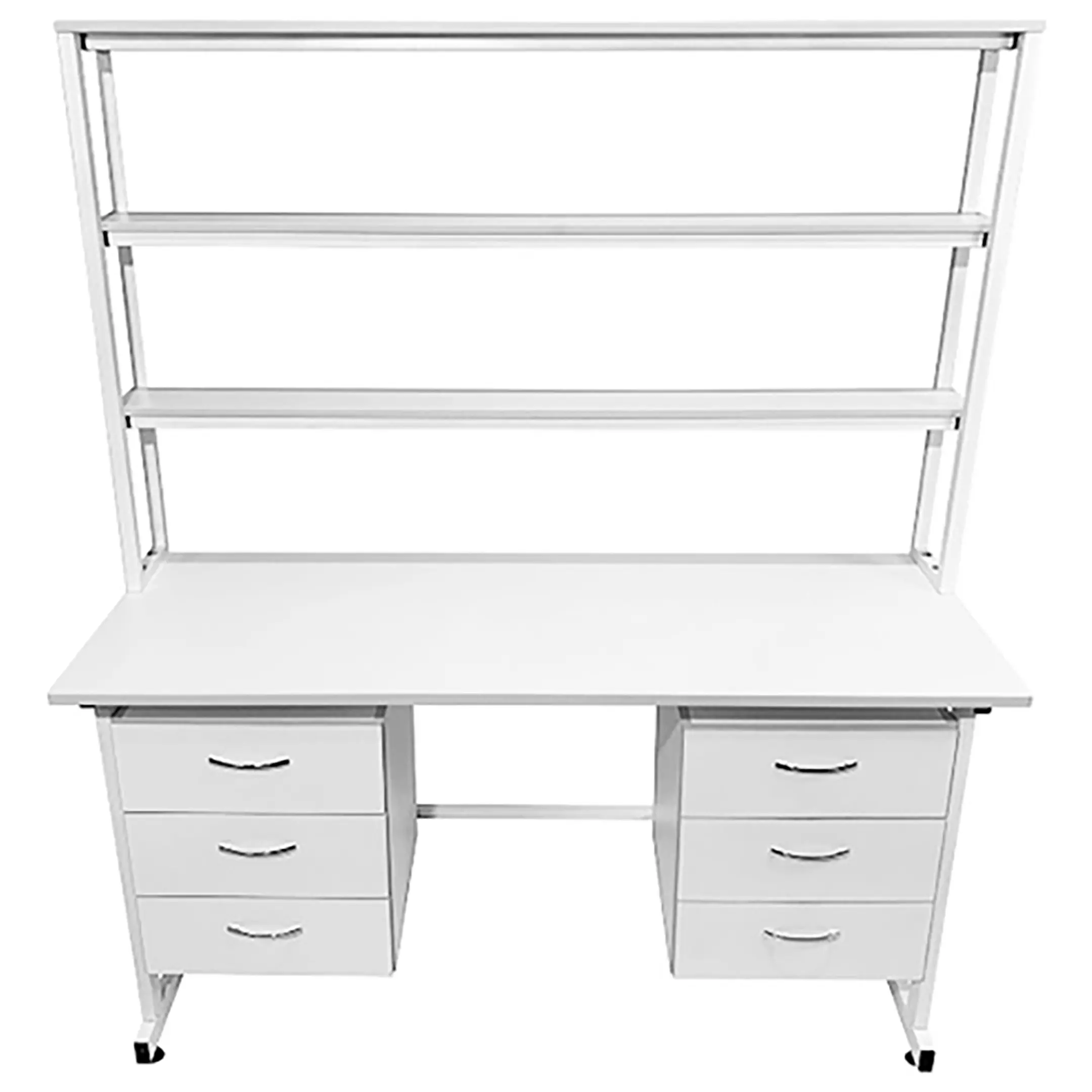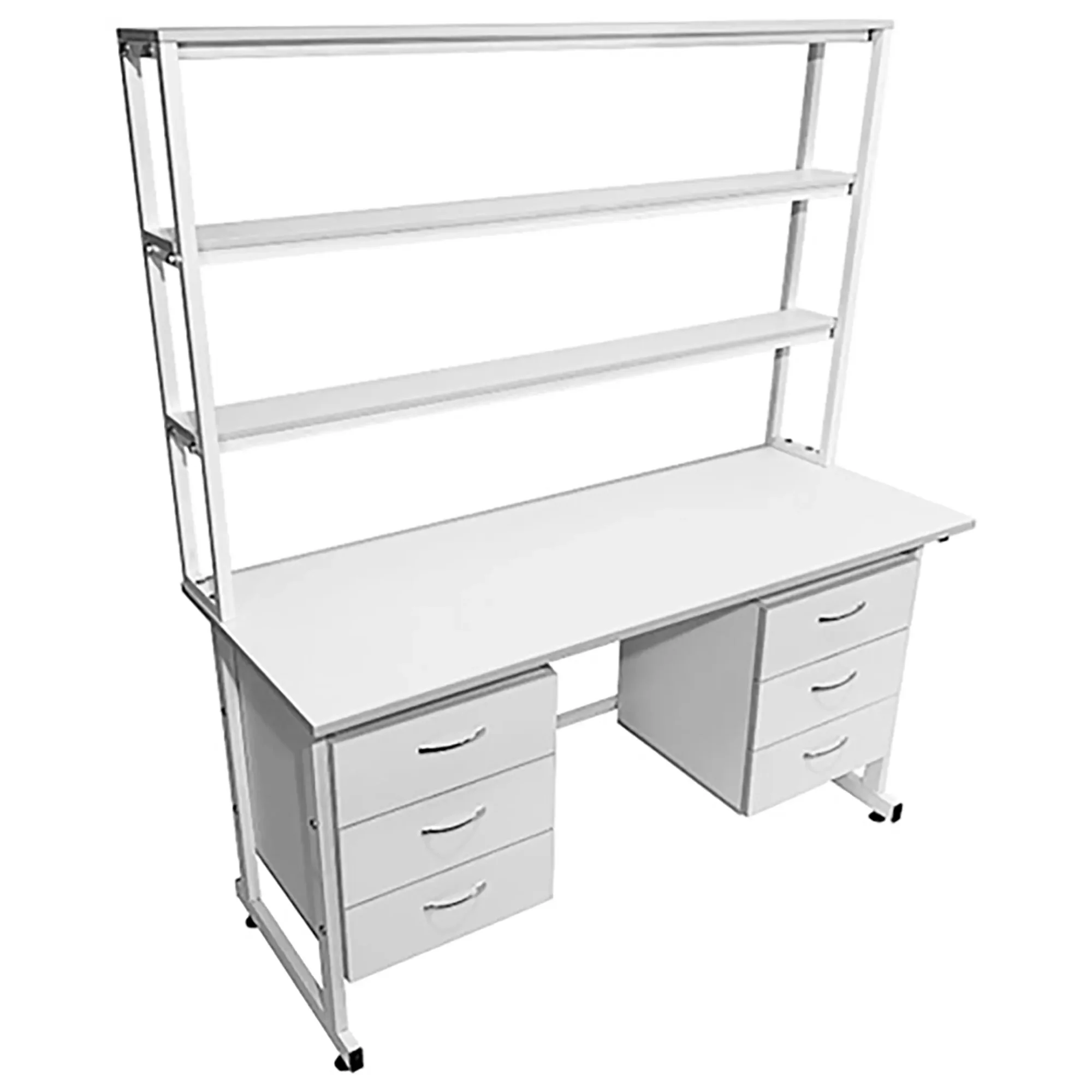 Стол лабораторный с надстройкой СЛн 16.008 (белый) — это исключительное решение для организации удобного и эффективного рабочего места лаборанта, занимающегося проведением химических исследований. Модель оснащена двумя подвесными тумбами с тремя выдвижными ящиками, надстройкой с тремя полками и металлическим защитным экраном. Каркас выполнен из стального профиля, столешница из ЛДСП толщиной 22 мм.