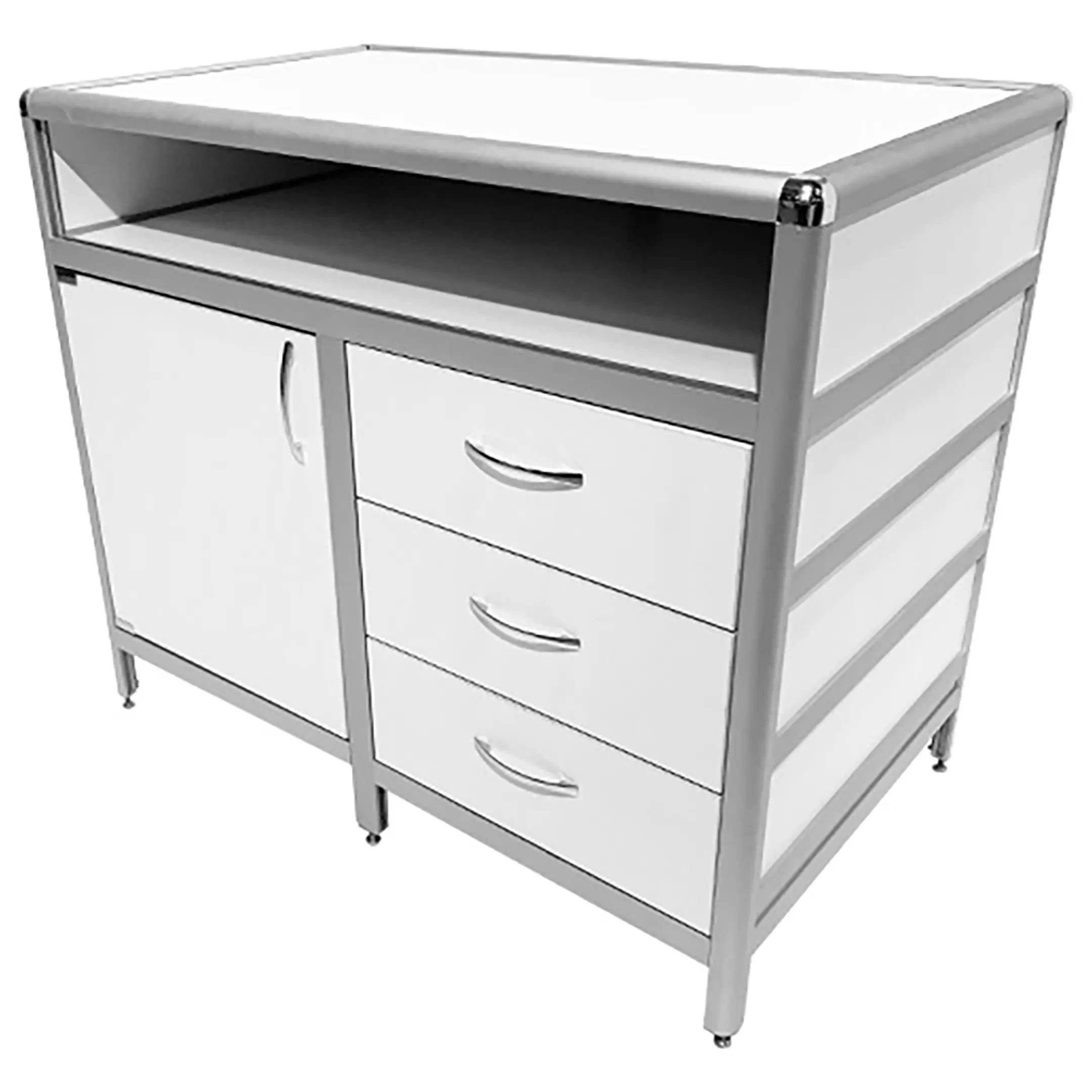 Стол-тумба лабораторная MED 12.008al (белый) — это функциональное решение для хранения лабораторного инвентаря, приборов и материалов в лабораториях и медицинских учреждениях. Модель оснащена вместительной нишей под столешницей (940х540х139 мм), тумбой с дверкой и полкой внутри, а также отделением с тремя выдвижными ящиками (434х70х406 мм). Каркас выполнен из алюминиевого профиля, столешница из ЛДСП толщиной 16 мм.