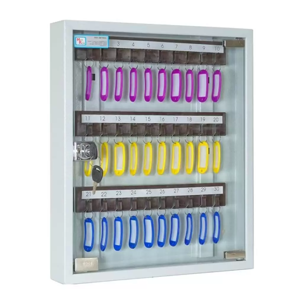 - Универсальная вместимость для рабочих мест и постов — система рассчитана на 30 ключей, что идеально подходит для организации хранения в отделе, на посту охраны, в диспетчерской или кабинете руководителя, где требуется поддерживать порядок для значительного, но не чрезмерного количества ключей.