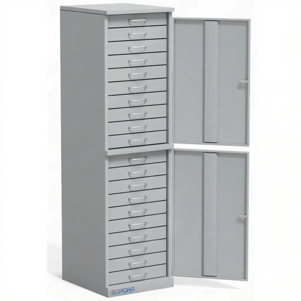 - Эргономика и эффективное использование пространства — вертикальная напольная конструкция позволяет компактно разместить большое количество ячеек для хранения. Работа с выдвижными ящиками на комфортной высоте снижает нагрузку на персонал и повышает производительность.