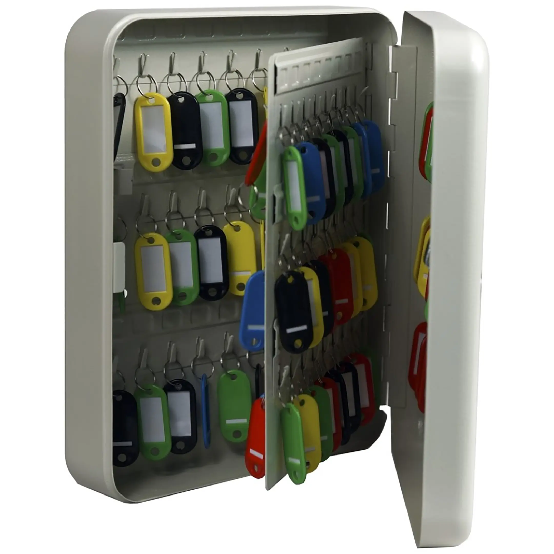 - Удобство для ежедневной работы и эргономичный дизайн — внутренняя панель с рядами пронумерованных крючков обеспечивает отличный обзор и легкий доступ. Комплектные брелки упрощают манипуляции с ключами. Возможность настенного или напольного монтажа позволяет выбрать наиболее удобное и контролируемое место для установки в соответствии с планировкой помещения.