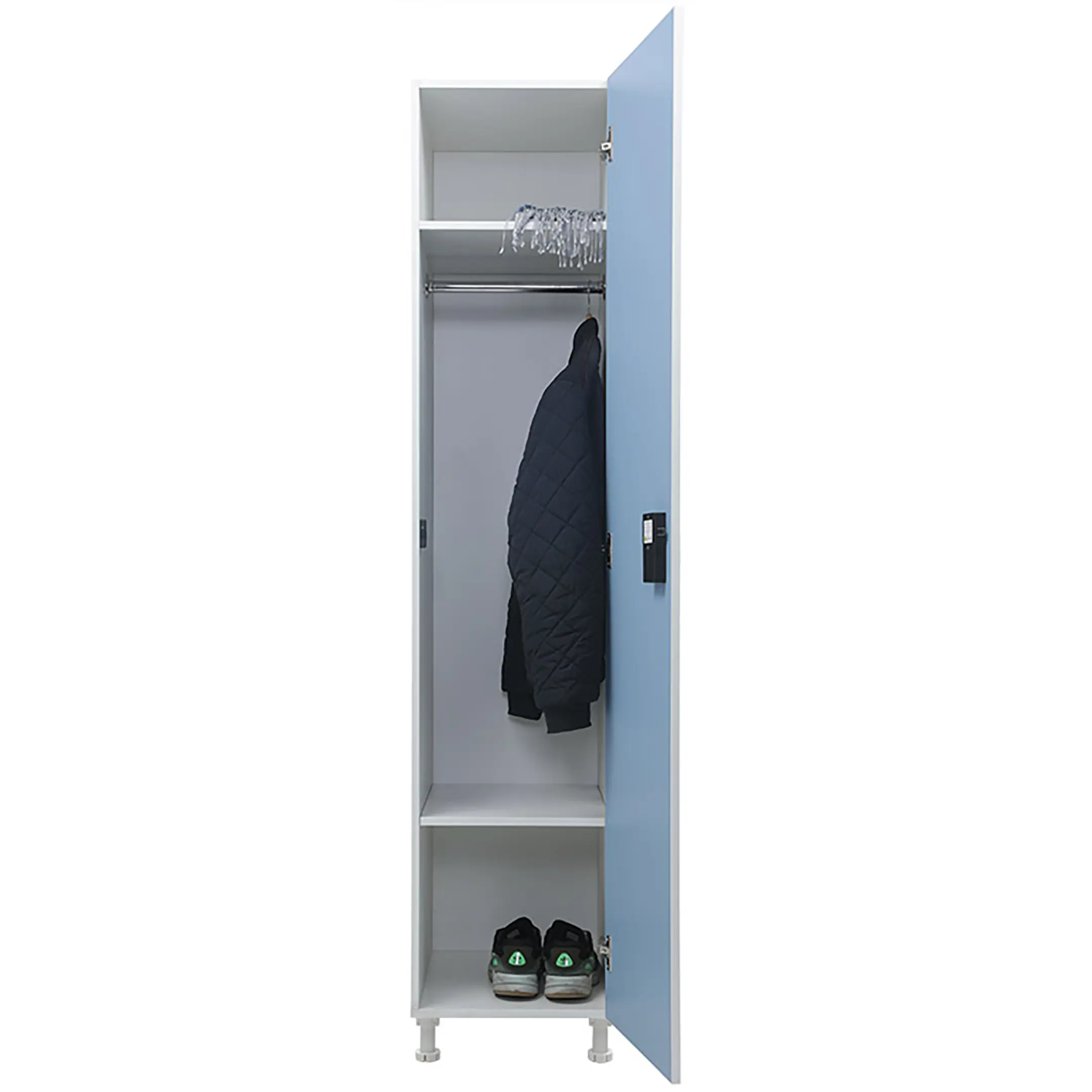 Шкаф для раздевалок WL 11-40 EL голубой/белый — это современное и функциональное решение для хранения одежды в спортивных, производственных, образовательных и других помещениях. Модель изготовлена из высококачественных материалов с применением современных технологий, оснащена электронным замком, выполняющим роль ручки для открывания двери.