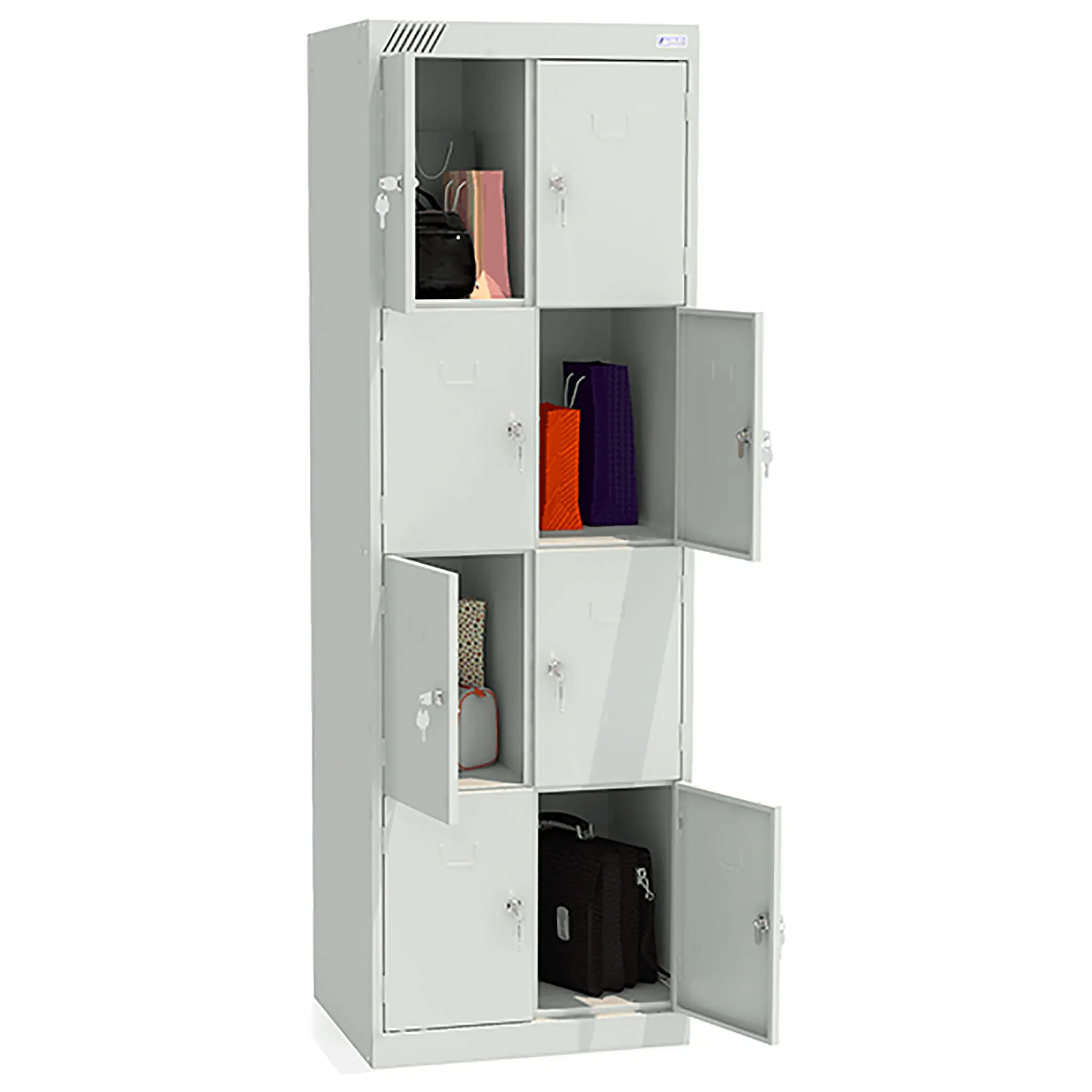- Вместительная конструкция — две секции и восемь ячеек обеспечивают индивидуальное хранение для нескольких человек.