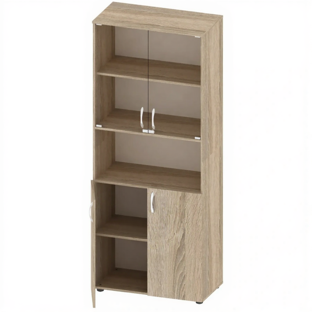 - Комбинированная конструкция — закрытое отделение со стеклянными дверцами для демонстрации и защиты содержимого, открытая ниша для быстрого доступа к часто используемым предметам.