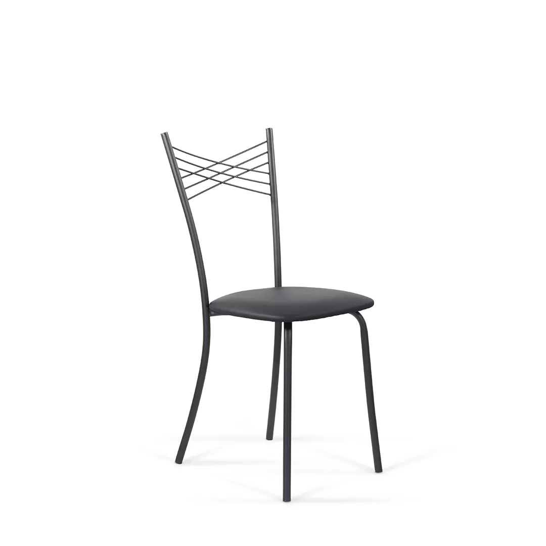 Воздушная модель стула имеет интересный дизайн спинки, представляющую собой крестообразное пресечение нескольких металлических нитей, образующих в центре маленькие ромбики. Каркас стула выполнен из металла.