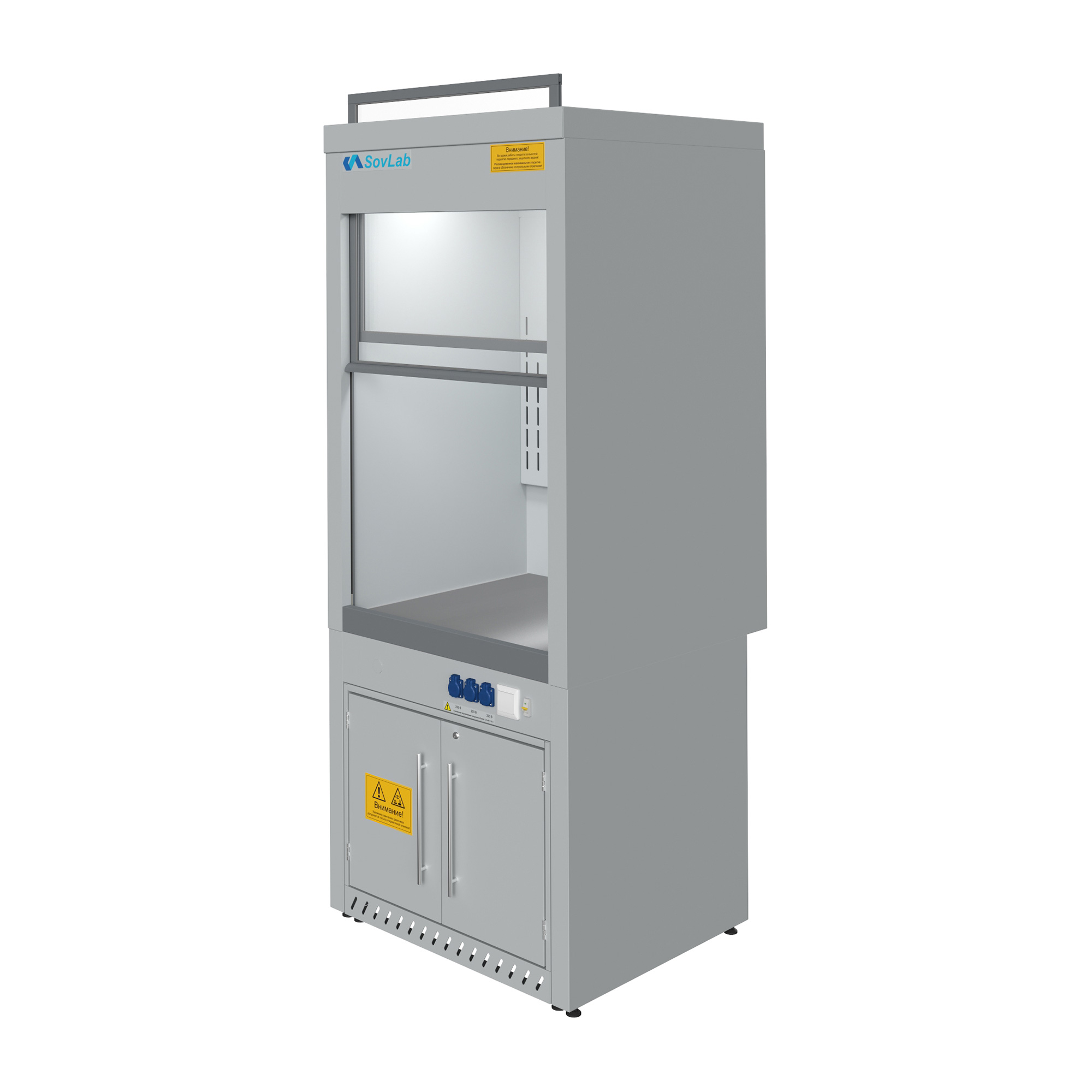 - Безопасная работа с летучими веществами — вертикально-подъемный защитный экран из ударопрочного стекла с системой противовесов для плавного хода и фиксации.