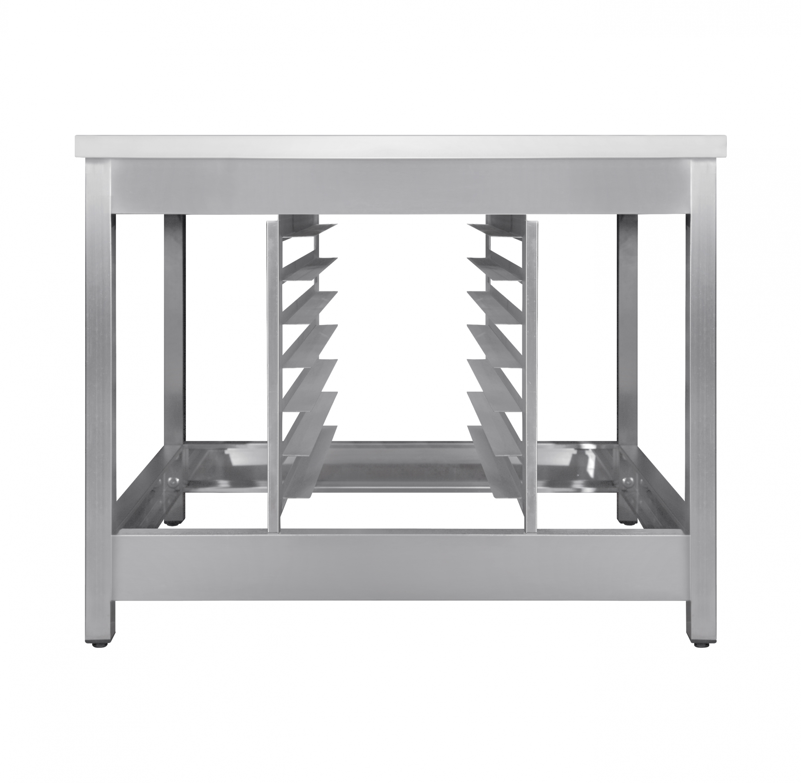В нижней части стола-подставки расположены полозья для размещения пекарских листов и противней. За счет регулируемых по высоте опор подставка максимально устойчива, что исключает раскачивание и опрокидывание техники.