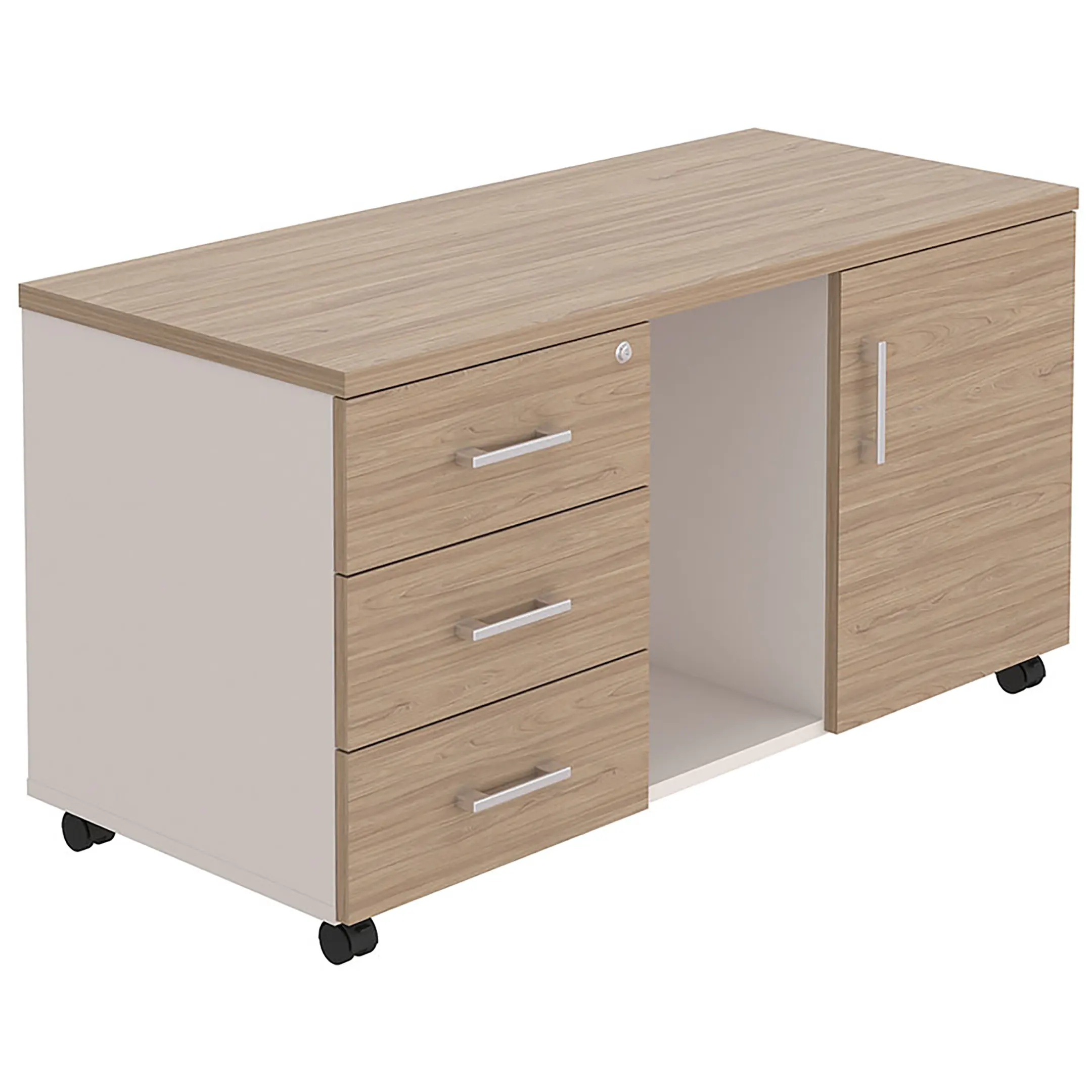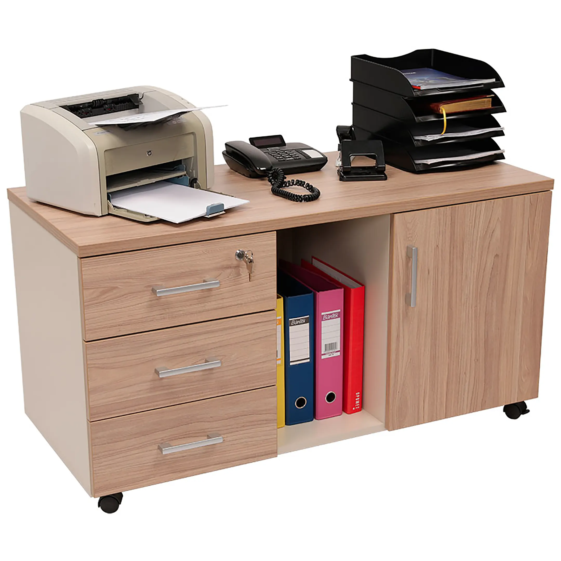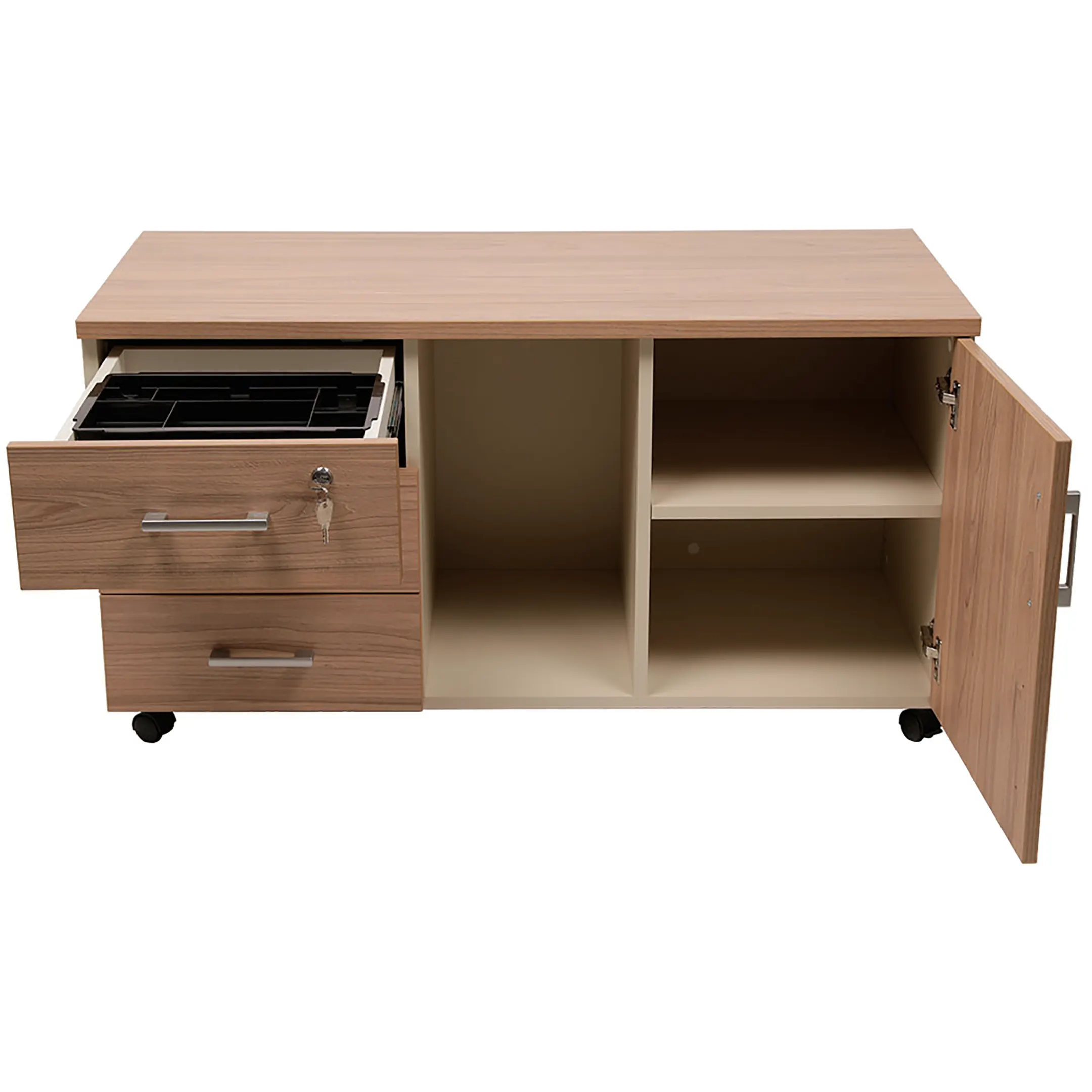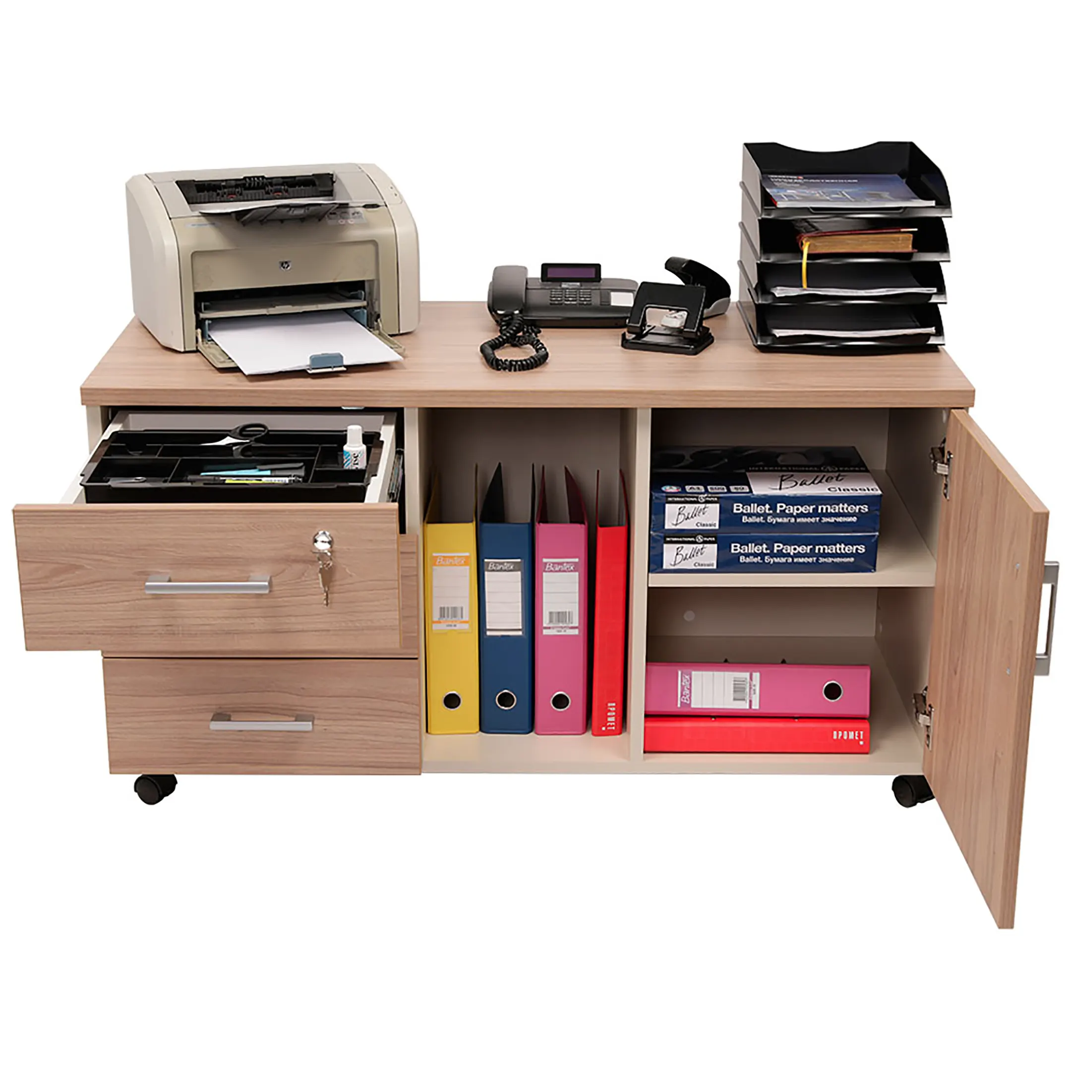 • верхний ящик тумбы снабжен замком и оснащен пластмассовым лотком для канцелярских принадлежностей;