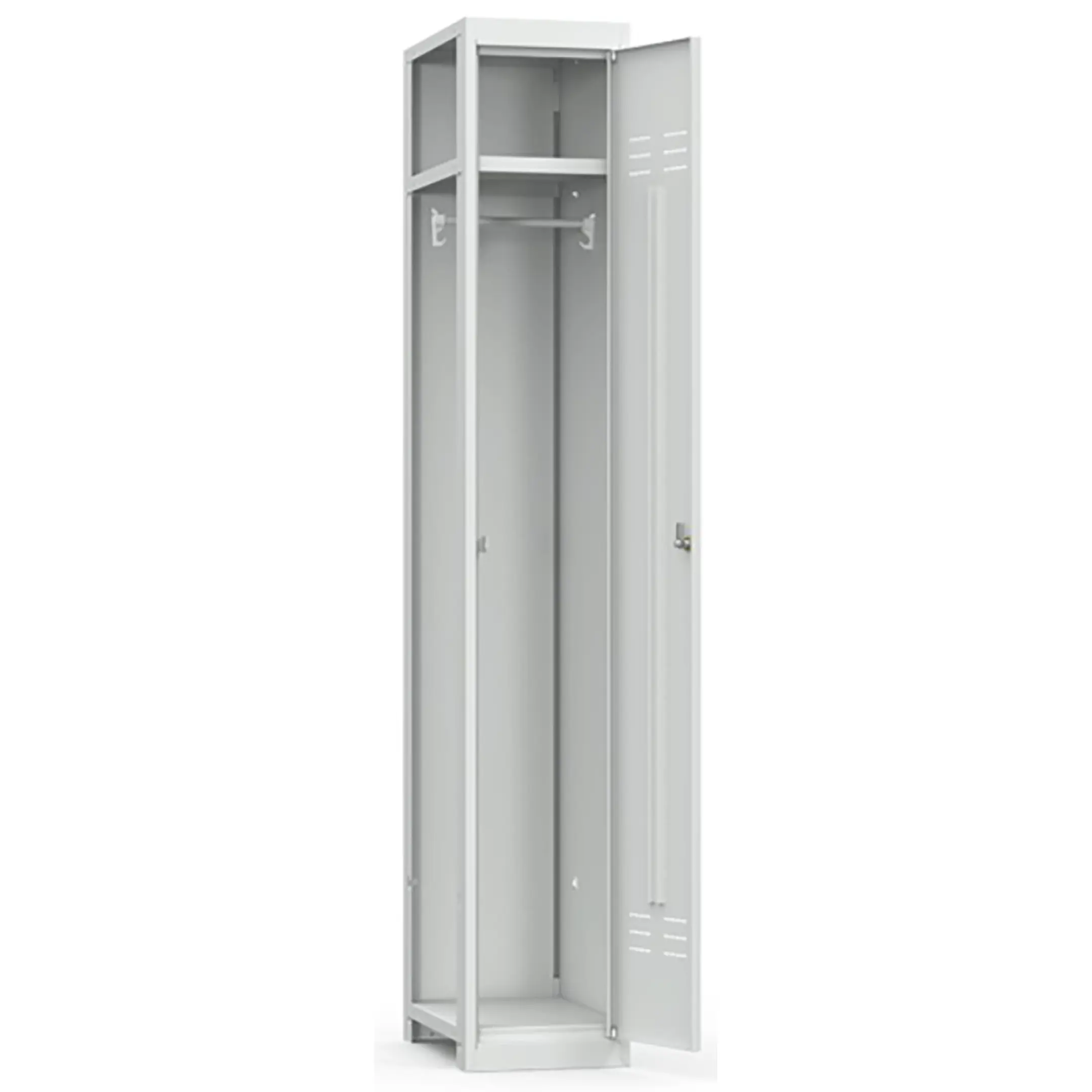 • Односекционный металлический шкаф для одежды имеет полную внутреннюю комплектацию: полку для головных уборов, пластиковые перекладины для вешалок и два крючка для одежды, проушина для навесных замков;