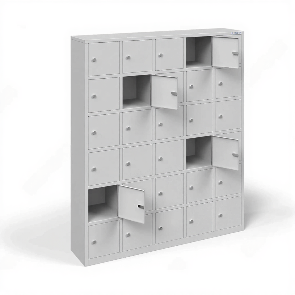 - Вертикальная компоновка и экономия пространства — шкаф высотой 1800 мм вмещает 30 ячеек, эффективно используя вертикальное пространство помещения. Это позволяет разместить большое количество мест для хранения, занимая при этом минимальную площадь на полу, что критически важно для узких холлов, рекреаций или проходных зон.