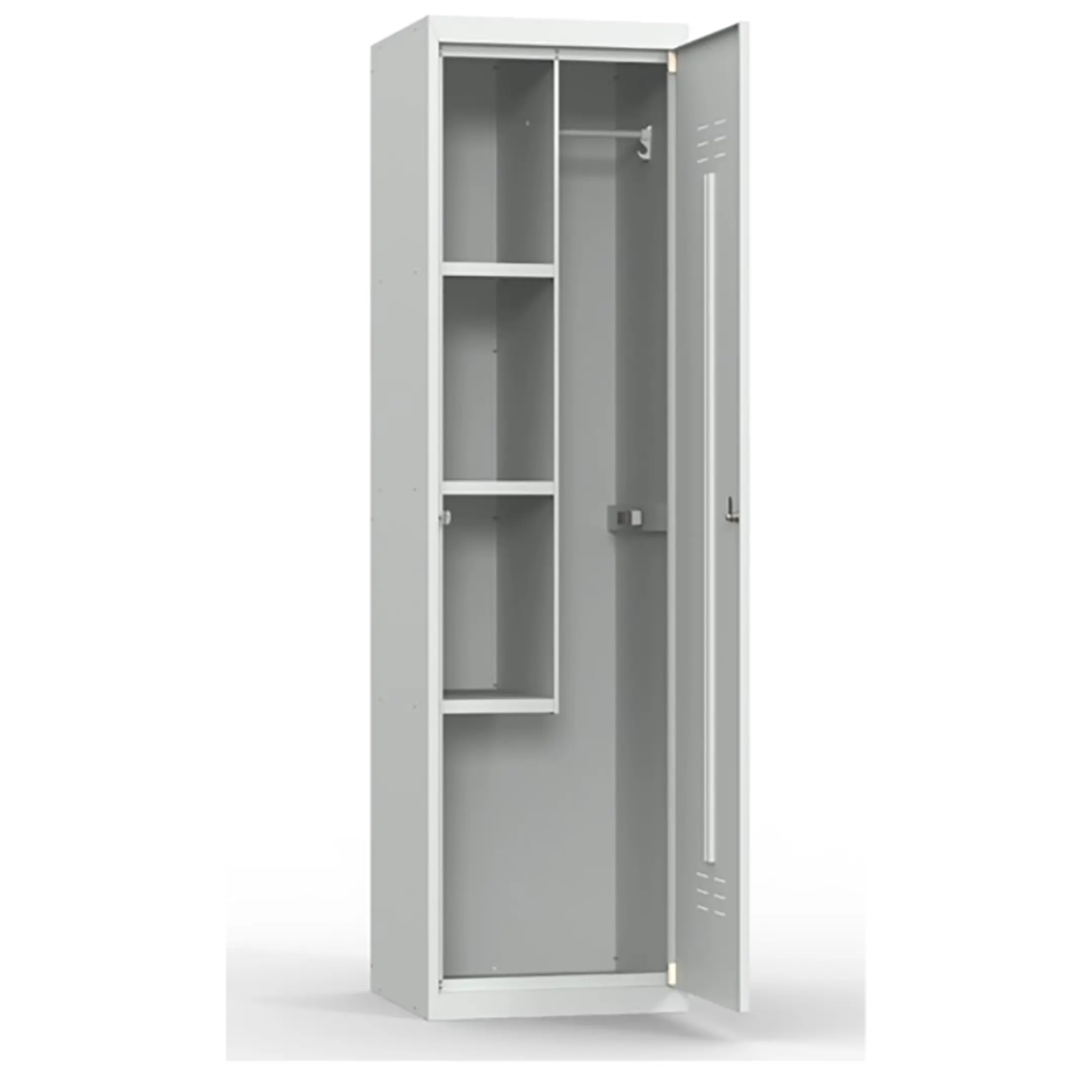 - Универсальность использования в различных зонах учебного заведения — модель подходит для применения в разных помещениях школы: классах, лабораториях, столовых, спортивных залах и медицинских кабинетах, обеспечивая везде безопасное и организованное хранение хозяйственного инвентаря.