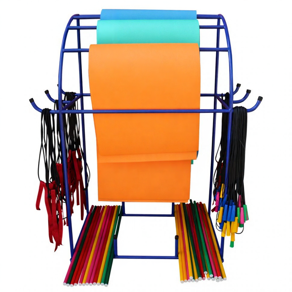 • Подвижный стеллаж — обеспечивает удобное хранение спортивного инвентаря и легко перемещается по спортивному залу для организации различных тренировок.